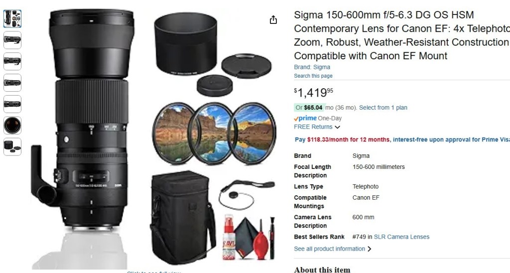 This is my wish list. These two are nice lenses, or as photographers say, “nice glass.” I have been wanting to get a picture of the moon, and I do believe that either of these would do the trick. One of these days I will be able to get one of these lenses.